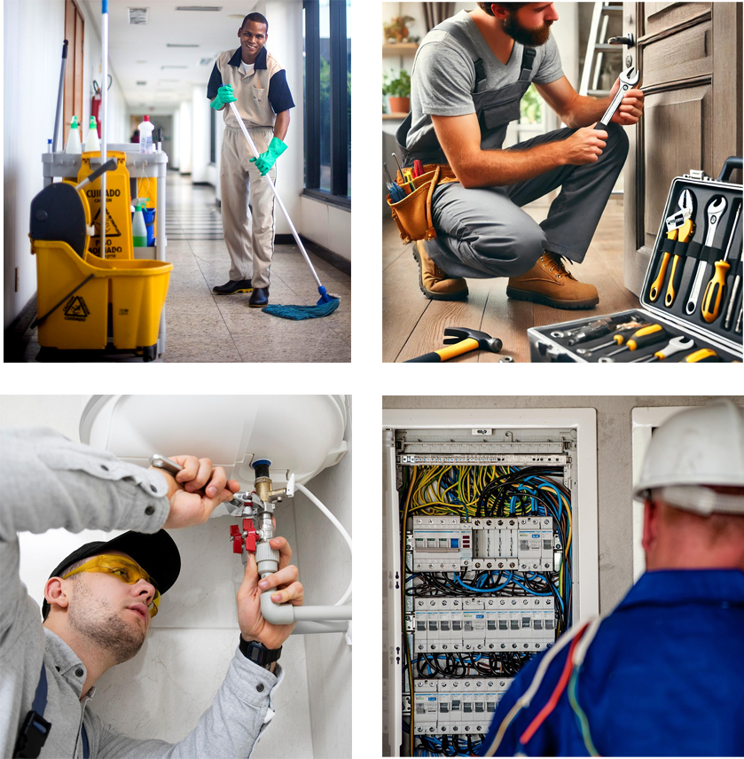 Unsere Organisation besteht aus einem Team von Fachleuten mit unterschiedlichen Profilen, von Reinigungskräften und Handwerkern verschiedener Fachrichtungen bis hin zu Experten für Marketing und Innenarchitektur.
